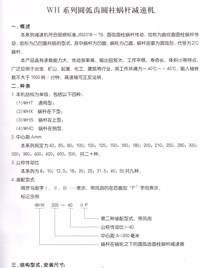WHC型圓弧齒圓柱蝸輪蝸桿減速機(jī)符合國(guó)家頒布標(biāo)準(zhǔn)(JB2318-79)包括WHT、通用型,HWX蝸桿在蝸輪之下、WHS蝸桿在蝸輪之上和WHC蝸桿在蝸輪之側(cè)四個(gè)系列。減速機(jī)的蝸輪與蝸桿嚙合部是凸凹嚙合,在嚙合區(qū)的絕大部分綜合曲率半徑大,提高了承載能力,同時(shí)該齒形合理地減薄了蝸桿齒厚。